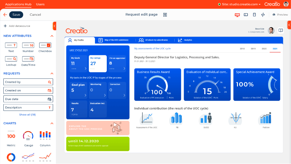 Платформа Creatio позволяет в единой среде создавать приложения и автоматизировать процессы как клиентских, так и внутренних департаментов. No-code платформа содержит инструменты для сквозной автоматизации всего предприятия: настройку интерфейсов и моделей данных, управление жизненным циклом приложений, проектирование цифровых процессов и интеграцию с другими системами, администрирование и управление доступом, пользовательскую настройку AI/ML-моделей.
